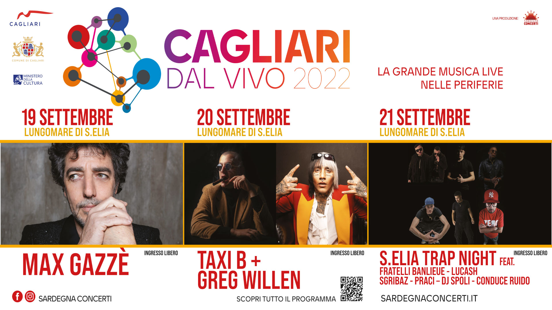Sardegna Concerti, organizzatrice degli eventi della categoria GRANDI MANIFESTAZIONI, presenta un calendario ricco di appuntamenti ad ingresso libero, che dal 27 Agosto animeranno le piazze delle periferie della città con grandi concerti per tutti i gusti.