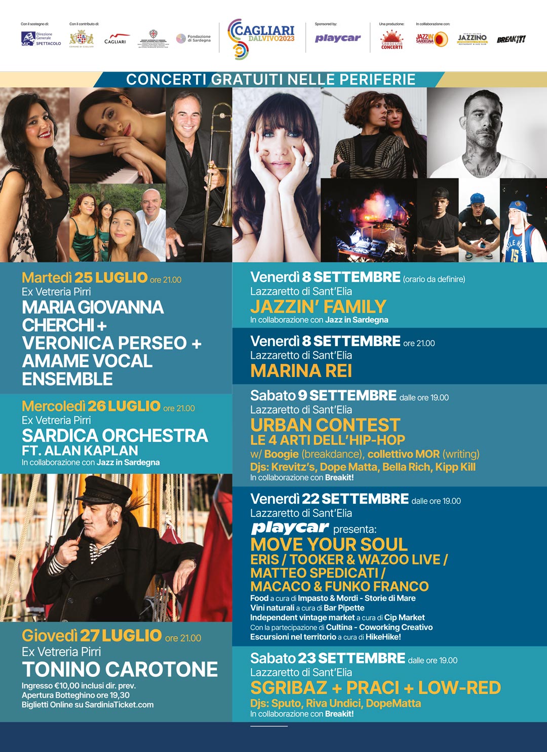 Sardegna Concerti, assieme a Jazz in Sardegna e all’Associazione Jazzino, tra gli organizzatori della manifestazione, presentano il ricco cartellone composto da decine di appuntamenti, per la maggior parte ad entrata libera, accompagnati da numerose attività collaterali e iniziative dedicate ai giovani all’insegna della sostenibilità, inclusività e accessibilità. Tra i tanti eventi, spazio anche a contest di hip-hop e break-dance, performance sonore per i piccolissimi nella fascia d’età 0-6 anni, esperienze legate alla scoperta del territorio, degustazioni enogastronomiche e la sponsorizzazione di Playcar, il car sharing di Cagliari, per promuovere la mobilità sostenibile.