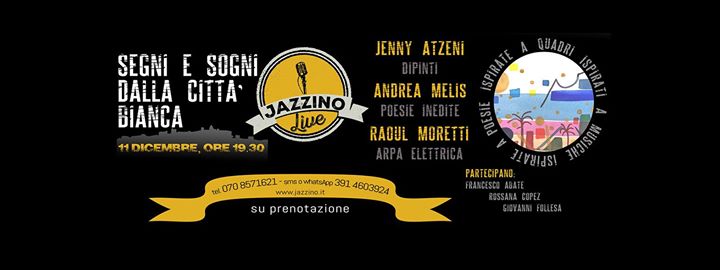 Sogni e Segni dalla città bianca è un evento unico e inedito che vede insieme tre artisti apparentemente molto diversi: Jenny Atzeni, che proporrà i suoi acquerelli inediti, Andrea Melis, che ha scritto delle poesie inedite ispirate ai dipinti, e Raoul Moretti, arpista, la cui musica ha fatto da colonna sonora a Jenny durante la nascita dei quadri e che a sua volta si è lasciato ispirare dalle poesie per comporre il reading che andrà in scena sul palco del Jazzino.
